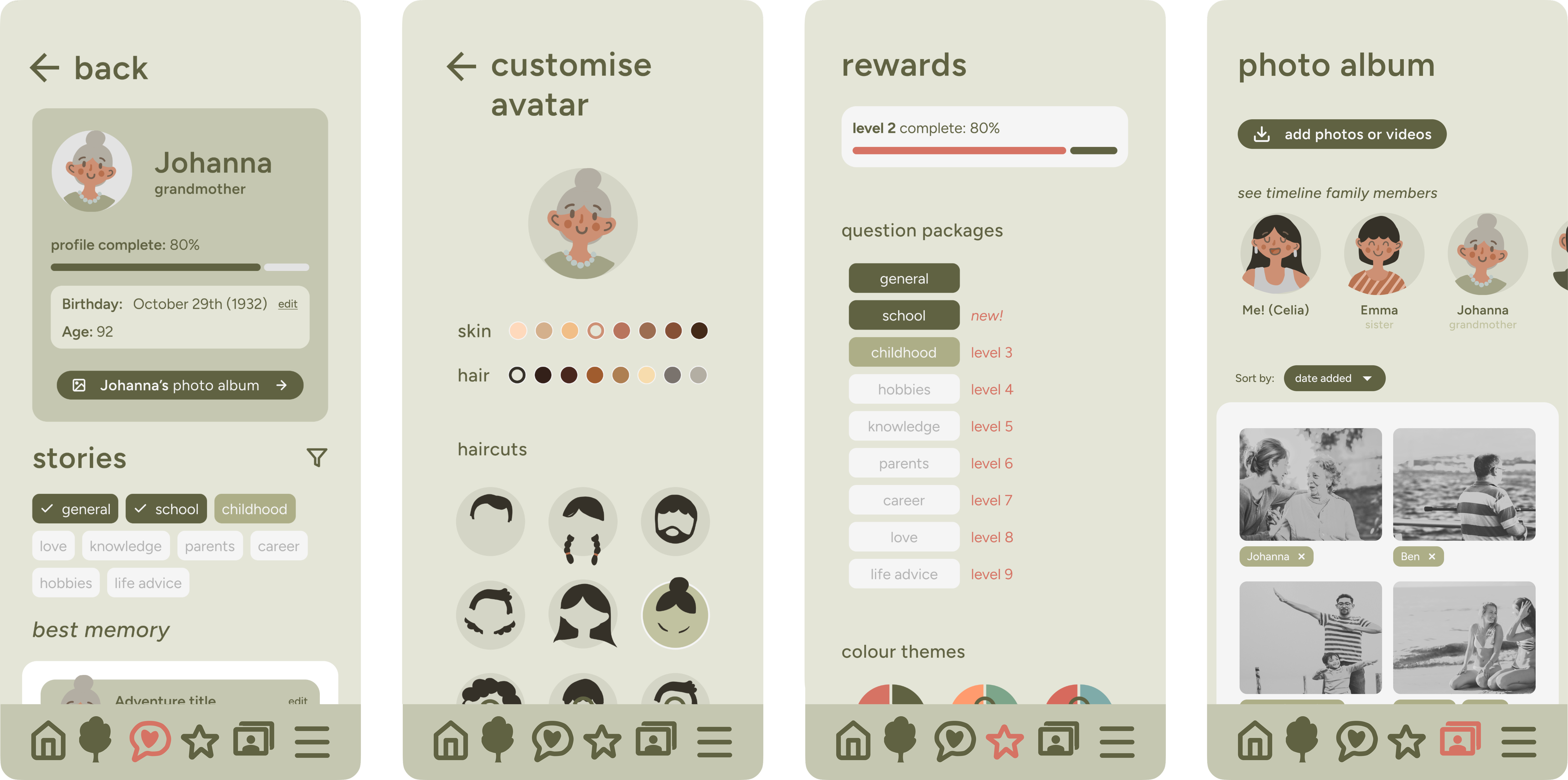 In the prototyping phase, the Roots app was developed as a family tree tool to connect young people with relatives with dementia through memory sharing, conversation prompts, and gamified engagement. Key requirements included secure local storage and a simple, intuitive interface for accessibility.